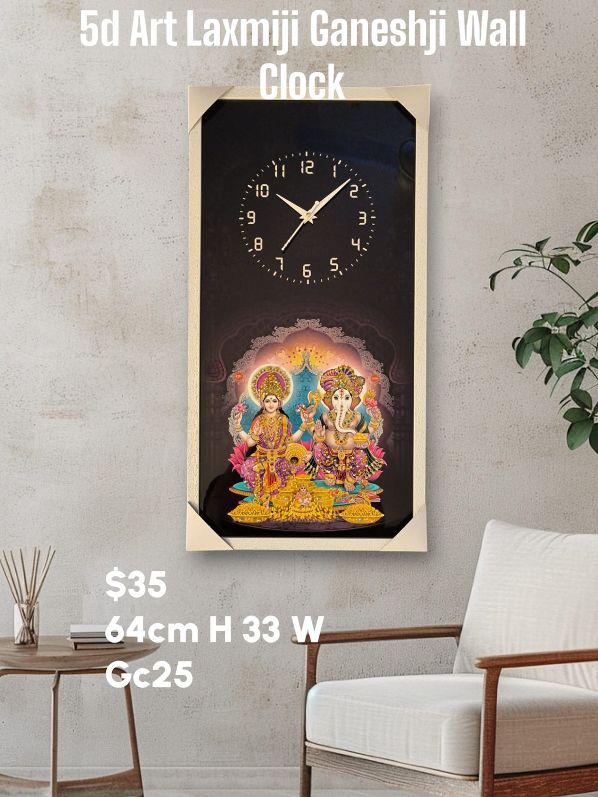 Bring prosperity and blessings to your home with this Laxmi Ganesh 5D Crystal Art Wall Clock, measuring 64cm high and 33cm wide. Crafted with a protective glass front, vibrant crystal-embedded 5D artwork, and a modern white wooden frame, this clock offers both spiritual value and elegant décor.