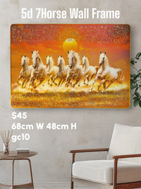 Running white 7 horses 5D crystal wall painting with gold alloy frame and diamond detailing – ideal for living room, entrance, office, or study décor.