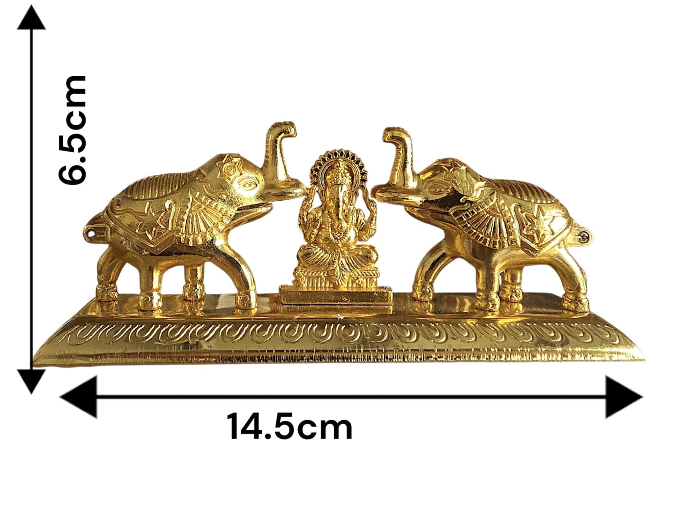 Add a touch of tradition and elegance to your pooja rituals with this beautifully designed Gold Metal Ganeshji With Elephants Chawal–Akshat Kumkum Box. Featuring Lord Ganesh seated between two intricately crafted elephants, this decorative box is perfect for storing chawal, akshat, kumkum, haldi, or other pooja essentials.