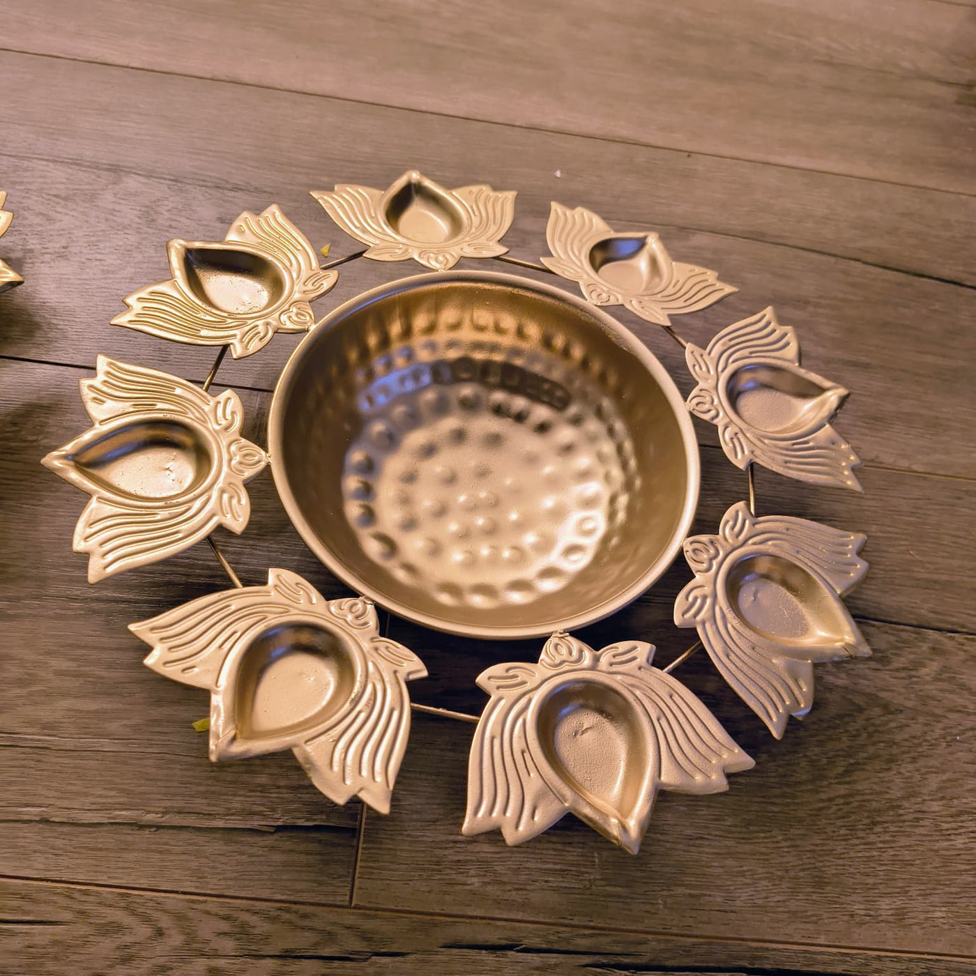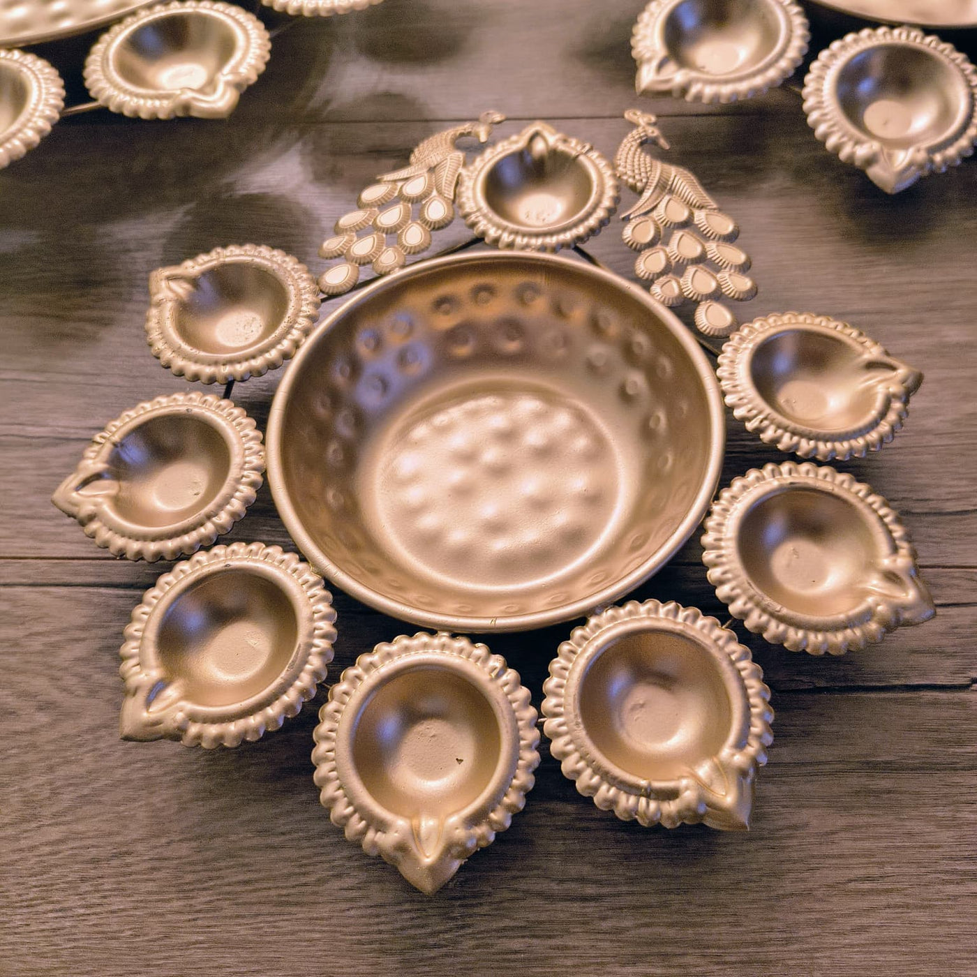 Add charm and tradition to your festive décor with these elegant 3pcs Urli Tray Sets available in Lotus design and Peacock design. Crafted with a beautiful golden finish, these trays are ideal for displaying flowers, tealights, or floating candles, making them the perfect centerpiece for Diwali, Ganesh Chaturthi, weddings, and pooja décor.
