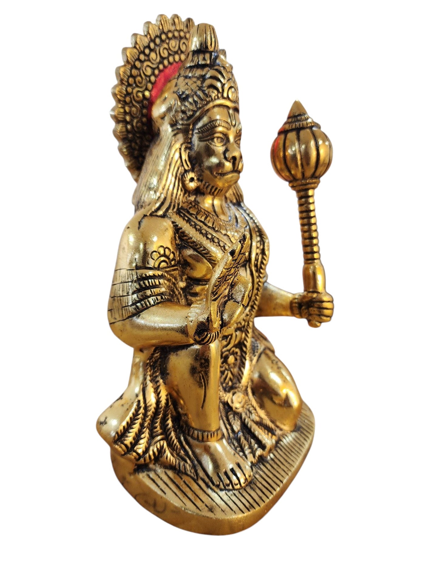 Bring strength, devotion, and divine protection into your space with this majestic 25 cm Gold Metal Hanumanji Idol, beautifully crafted in a seated posture. Cast in radiant gold-toned metal, Lord Hanuman is depicted holding his iconic gada (mace), a symbol of strength and loyalty, while a chakra (divine disc) adorns the backdrop—signifying power, righteousness, and spiritual energy.