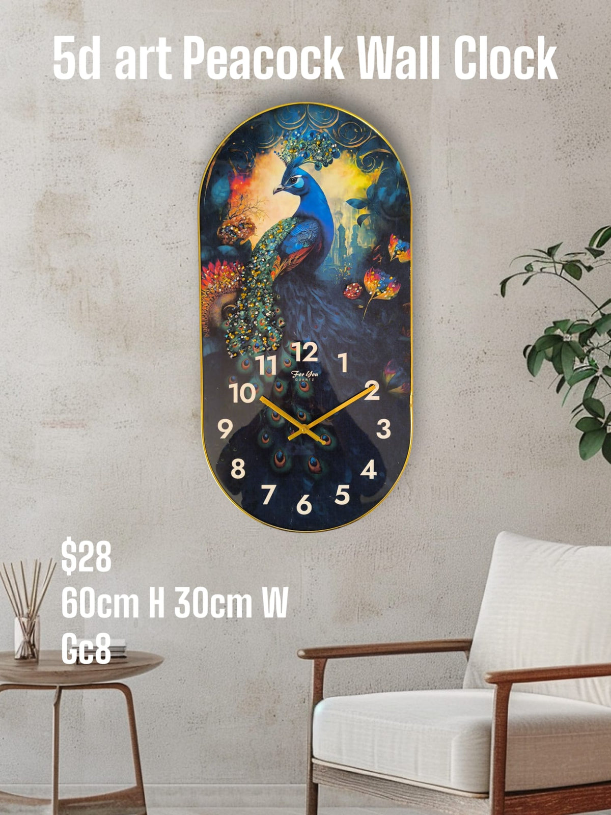 Grace your space with timeless elegance using this Peacock 5D Art Wall Clock, sized at 60cm height and 30cm width. Featuring a majestic peacock design brought to life with 5D visual depth, this clock radiates beauty, vibrancy, and sophistication. Its intricate feather details and bold colors make it a perfect fit for living rooms, hallways, or gift-giving occasions.